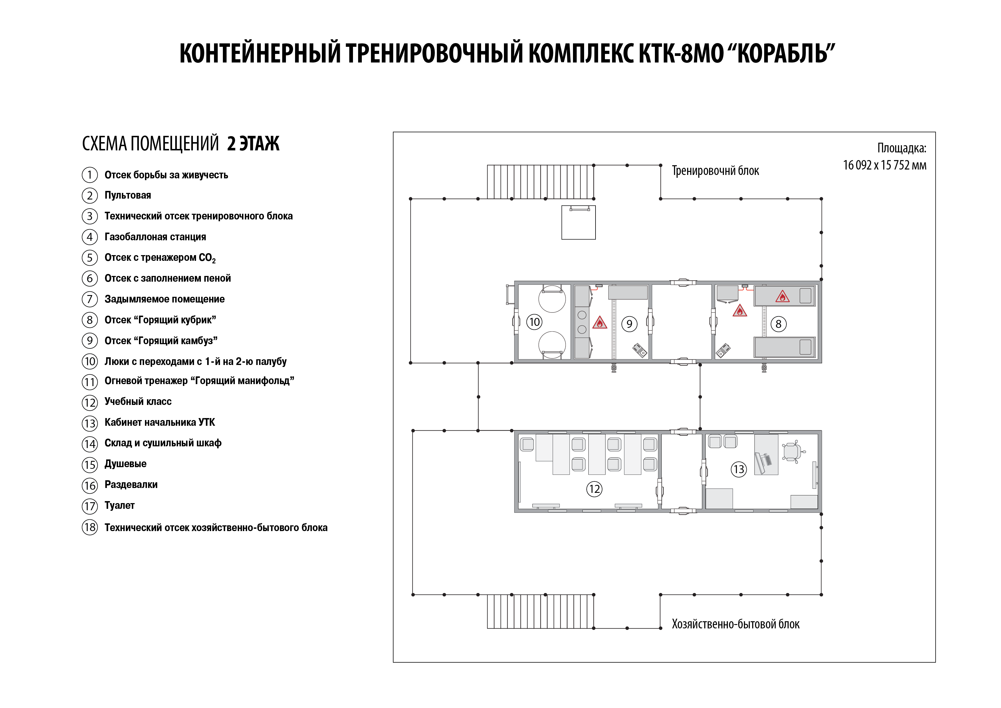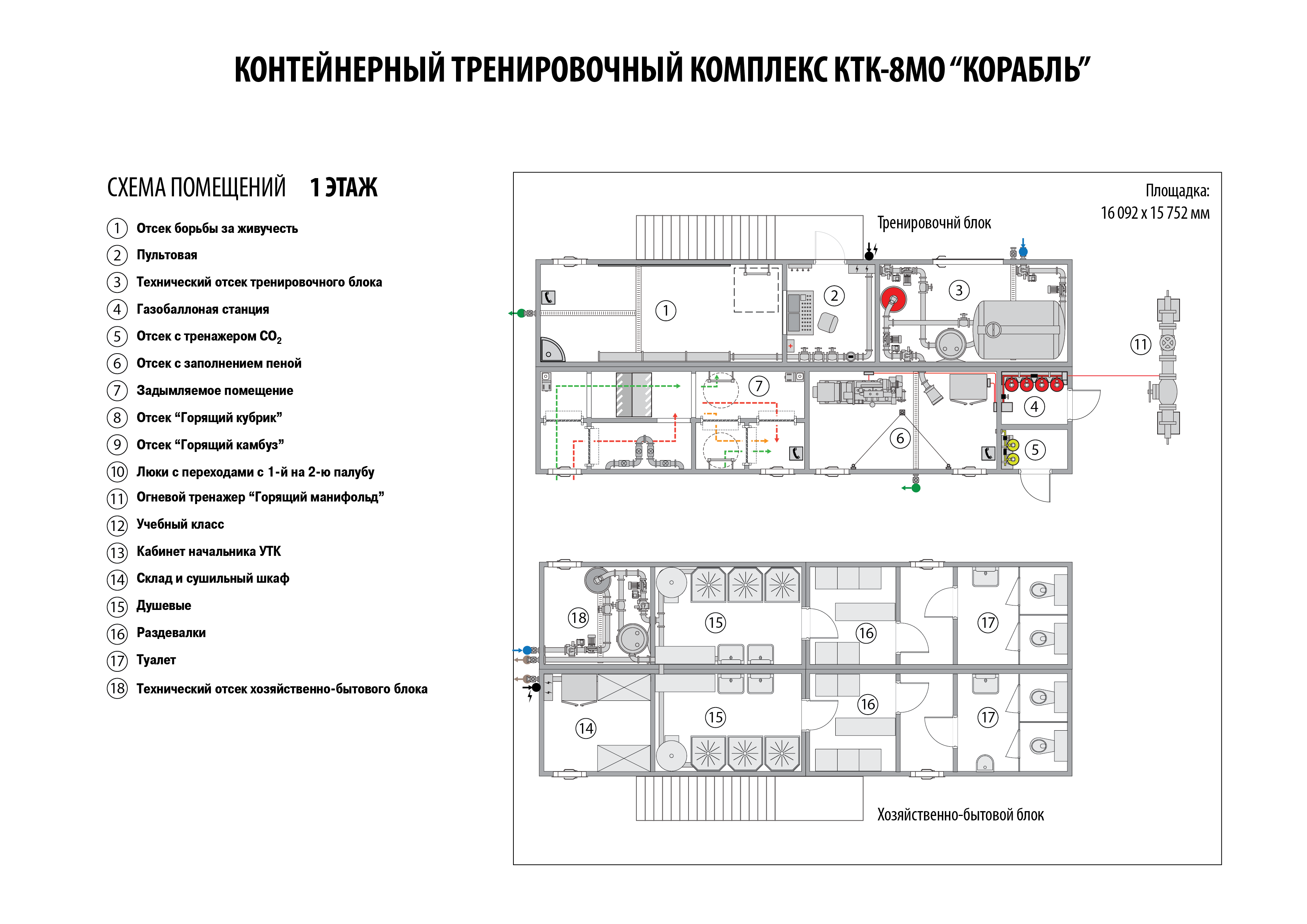 В комплексе предусмотрены такие ключевые элементы, как отсек управления, где располагается пульт управления для мониторинга и координации учебного процесса, а также технические помещения для обслуживания систем и оборудования.